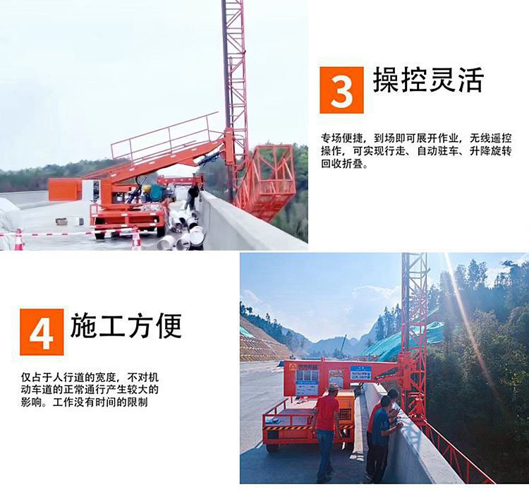 它(ta)可的優(yōu)勢是可(ke)以跨越(yue)人行道(dào)、防抛網(wang)、聲屏障(zhang)等障礙(ài)物伸到(dao)橋梁側(cè)面施工(gong)。
