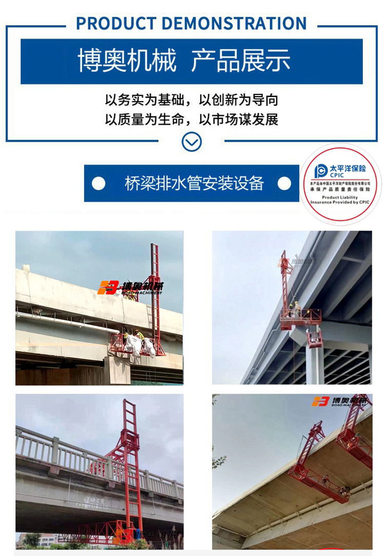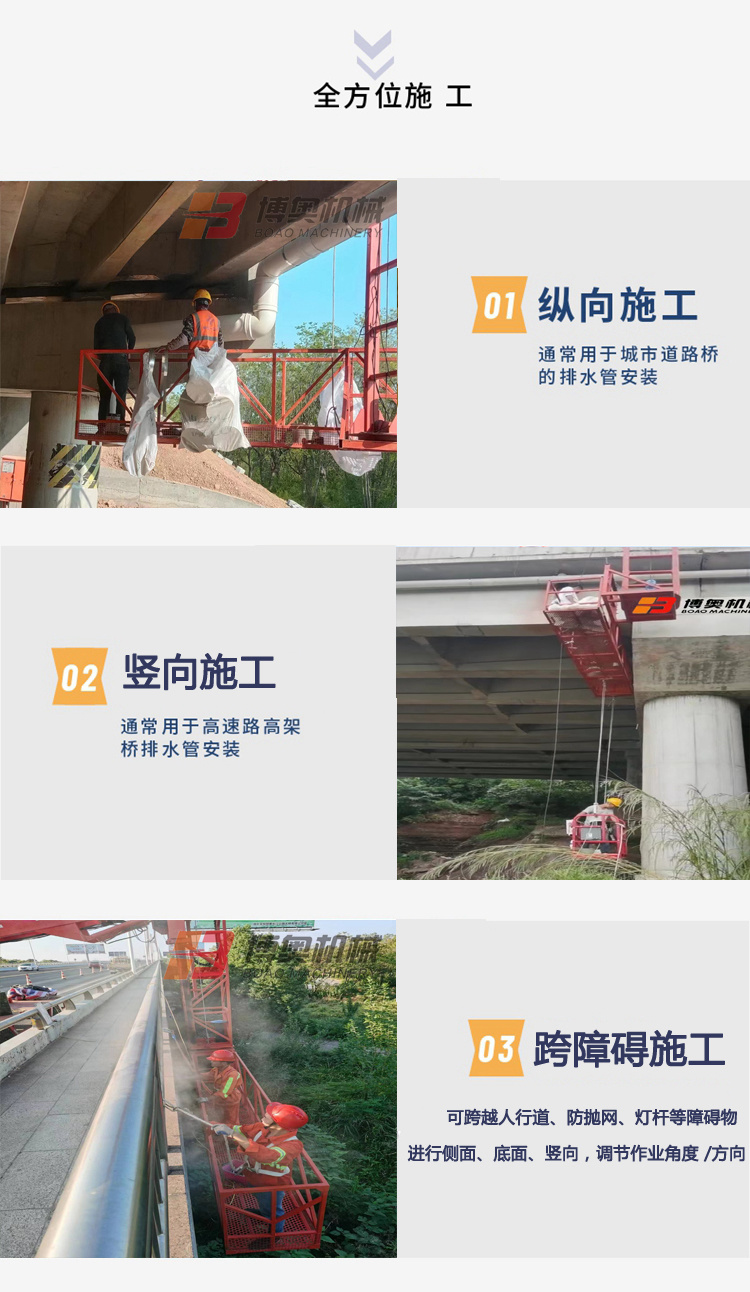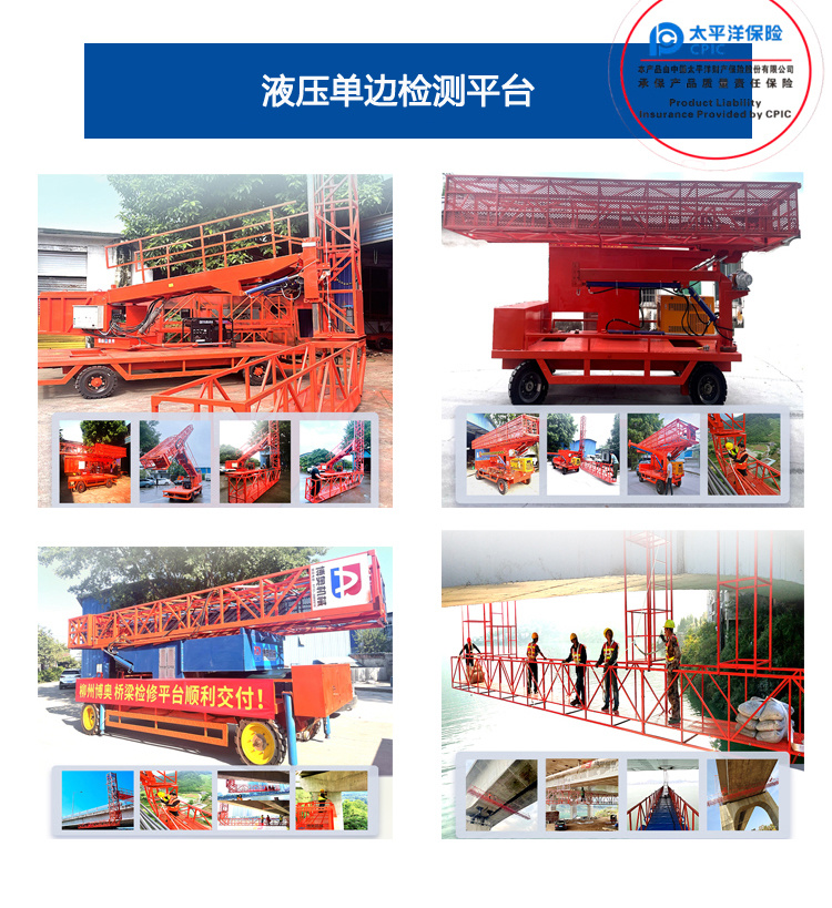 單邊橋梁檢測(cè)車也叫排水管(guan)安裝設備,技術(shu)參數:施工平台(tai)長:4-5米,載重可達(da):300~500KG