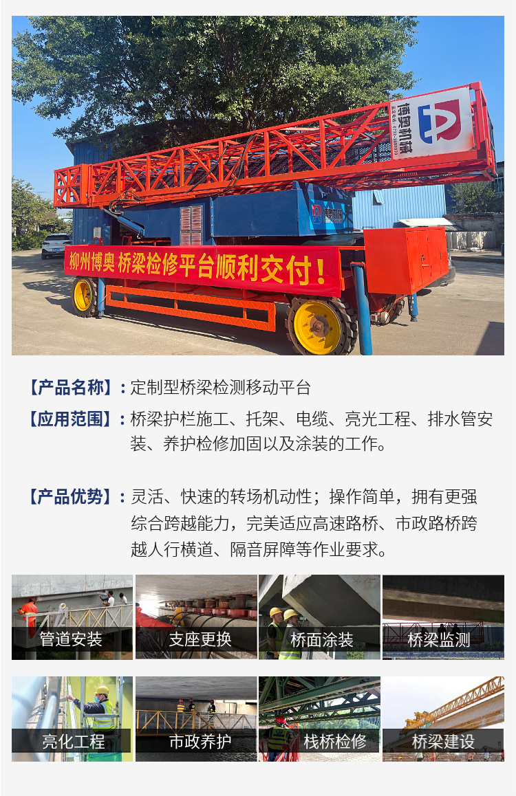 在新型BAQJ13M橋梁(liáng)檢測移動平台(tai)的設計中,采用(yong)桁架拼接式結(jié)構設計、高強度(dù)航空鋁合金伸(shen)縮吊籃平台,重(zhòng)量⭐更輕,穩定性(xìng)更強。擁有更超(chao)強綜合跨越能(néng)力,完美适應高(gao)速路橋、市政路(lù)橋、人行橫道、隔(ge)音屏障等工況(kuang)要求。